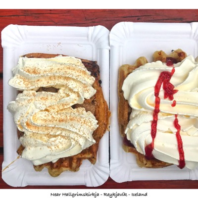 Emily slept well on the flight and was out pretty early into it, perhaps the Benadryl helped her. I stayed up for a while and had the meal on the flight which was either BBQ chicken or a pasta. I attempted the bbq chicken and it was eh, but edible I slept for a bit afterwards. The plug on our seat didn’t work unfortunately, thanks again American. The flight was scheduled for 8 hrs or so but we made it in about 7 hrs 15 min, a little late because of the hour delay out of DFW, but only by 20 minutes or so according to the ticket. We landed and made it through immigration just fine. We had a bit of a wait for the rental car shuttle (we later figured out its only a 10 min walk) but made it to Blue Car Rental. We picked up for Kia Rio and headed to Reykjavík with Emily behind the wheel (she did most of the driving this trip). Along the way, I added the high speed data through Sprint onto Em’s phone, which worked very well in Iceland and Norway. It was about a 45min drive to our AirBnB in the heart of Reykjavík. Check in was at 2:00 PM and it was only 12:45, but we were able to park the car at the apartment. The AirBnB was on the very edge of the tourist area and in great location! We walked the main tourist area of Reykjavík and checked out some shops, we eventually ended up at the big church there called Hallgrímskirkja. Very very pretty inside! We grabbed a pair of waffles, mine with strawberry and whipped cream, Em’s with caramel, cinnamon and whipped cream. These things were delicious!!