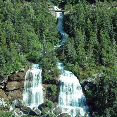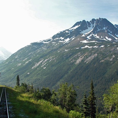 We were quickly underway and was amazed by the valley the railroad followed up to the White Pass. The scenery was specular! Our since locomotive had no trouble with the small train. On the back platform of the coach, we could see the first trains of the day, full of cruise ship passengers, starting out of Skagway behind us. At the White Pass summit, our train stopped and let off some hikers as well as a group of rail fans that were there to photograph the days trains coming into the summit, lucky guys!